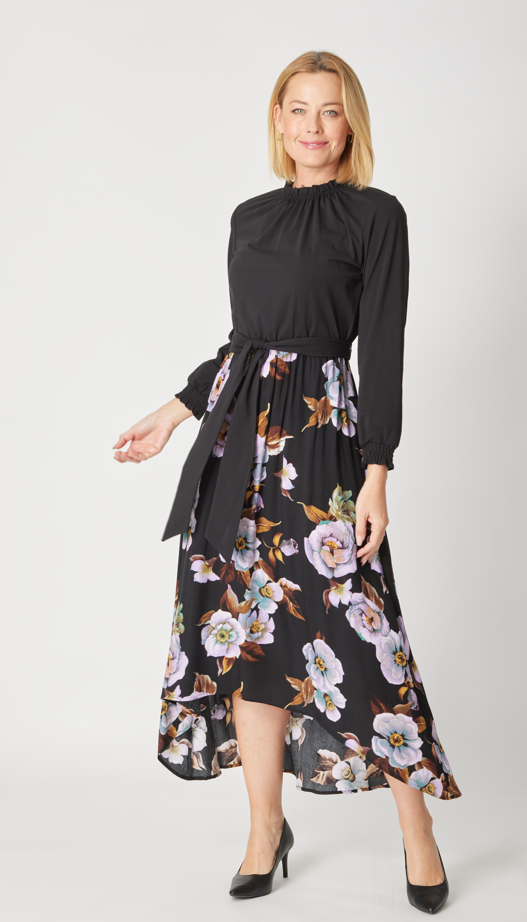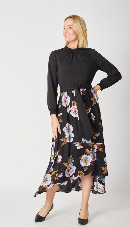 Look sleek and sophisticated with the black base and stunning floral print on the skirt with its high/low hemline. It has a tie waist which flatters your shape.