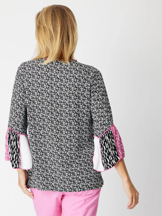 Experience ultimate comfort and cuteness with our Sweet Sandy Spliced Top. The soft and floaty sleeves will keep you feeling cool all day long. Featuring 3/4 sleeves, a v-neck with tye detail, and a hotpink baby overlock trim, this top is a must-have for your wardrobe. Get yours now and elevate your style game!