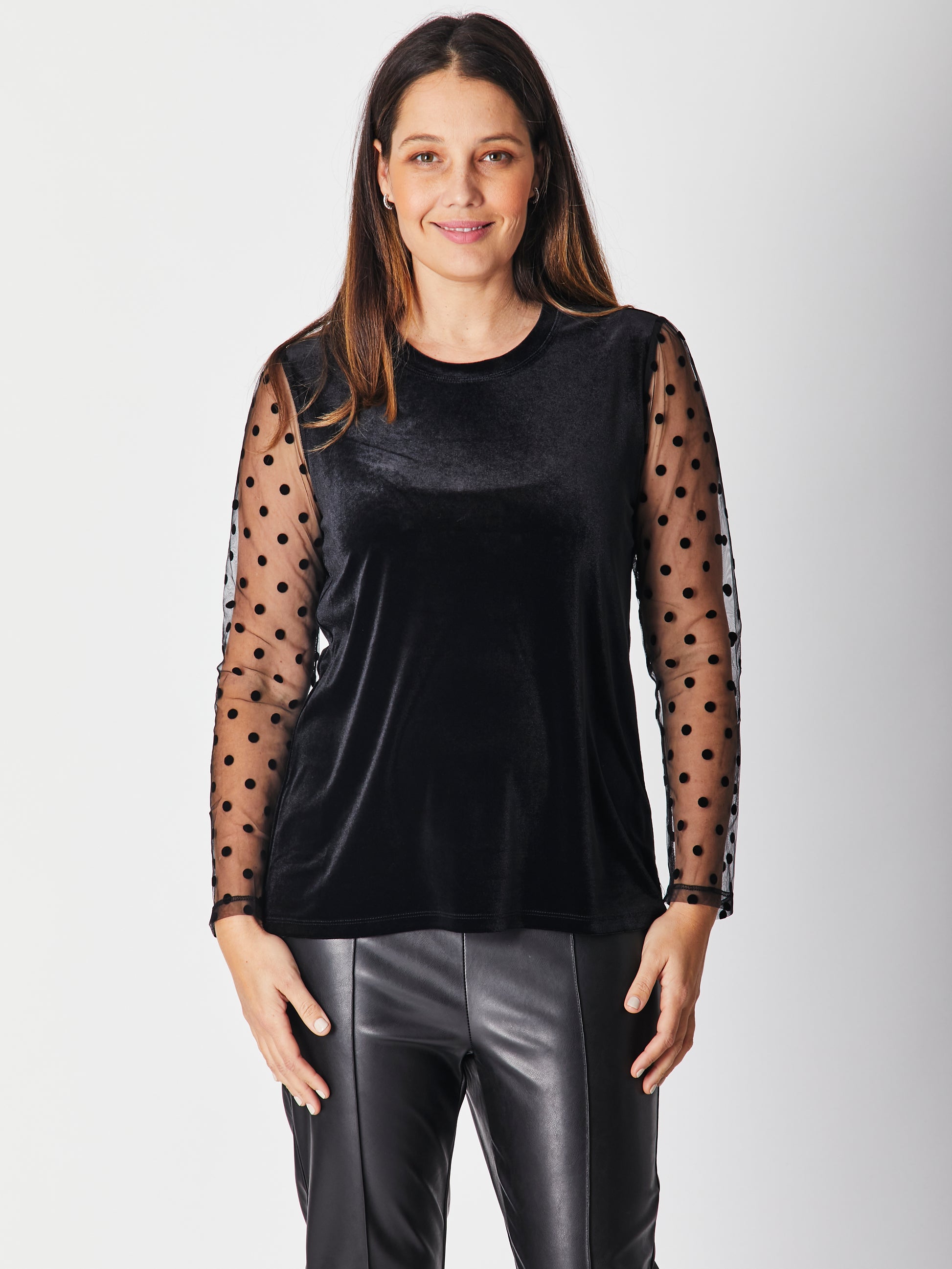 The Spot Top is effortlessly easy and essential. This go-to top is featured in a velvet fabrication with the right amount of stretch and an all-over print. The arms are a mesh spot material. This makes this printed top a goes-with-everything wardrobe staple.