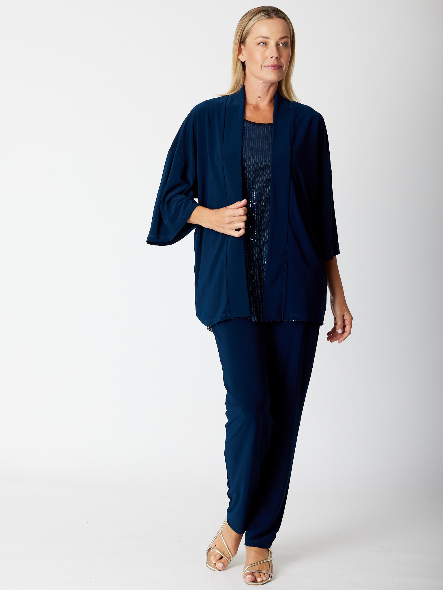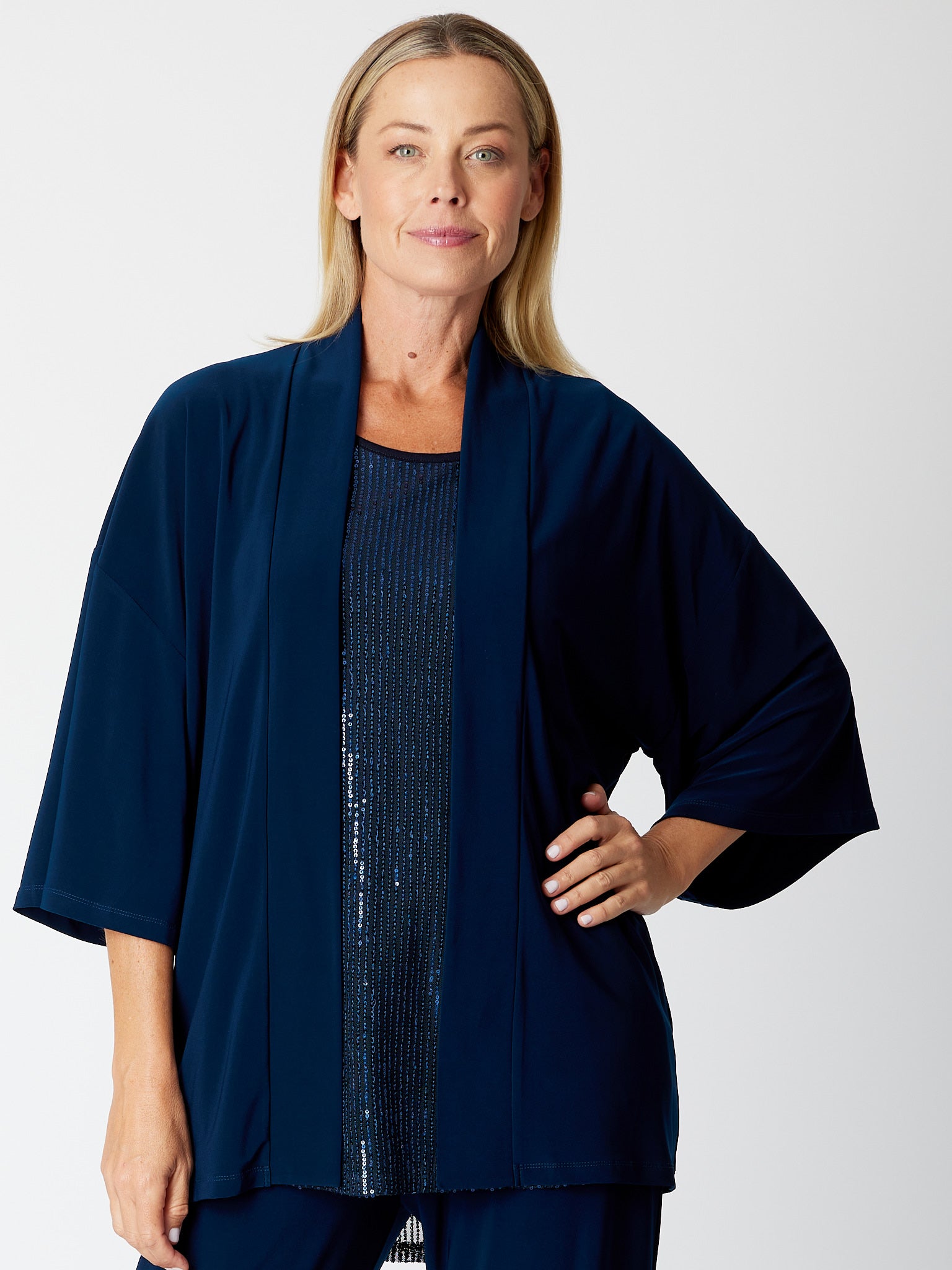 This jacket features a sleek, tailored silhouette that flatters any figure, making it a versatile addition to your wardrobe. The rich navy hue adds a classic sophistication, while the kimono-inspired design brings an element of unique style. Perfect for both casual and formal occasions, this jacket can be paired with a crisp white shirt for a polished office look or layered over a simple tee and jeans for a chic weekend ensemble. The soft, stretchy fabric ensures all-day comfort, allowing you to move with ease and confidence.