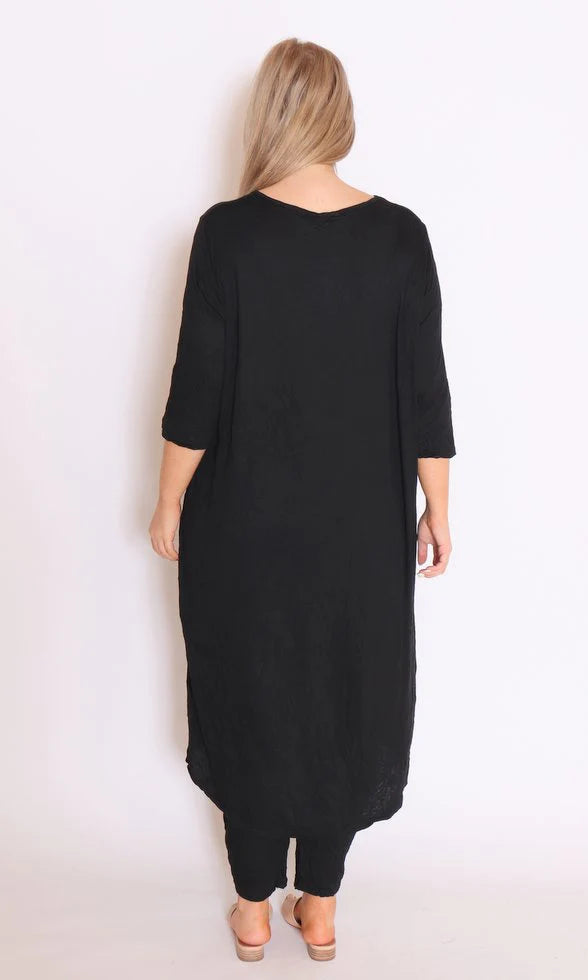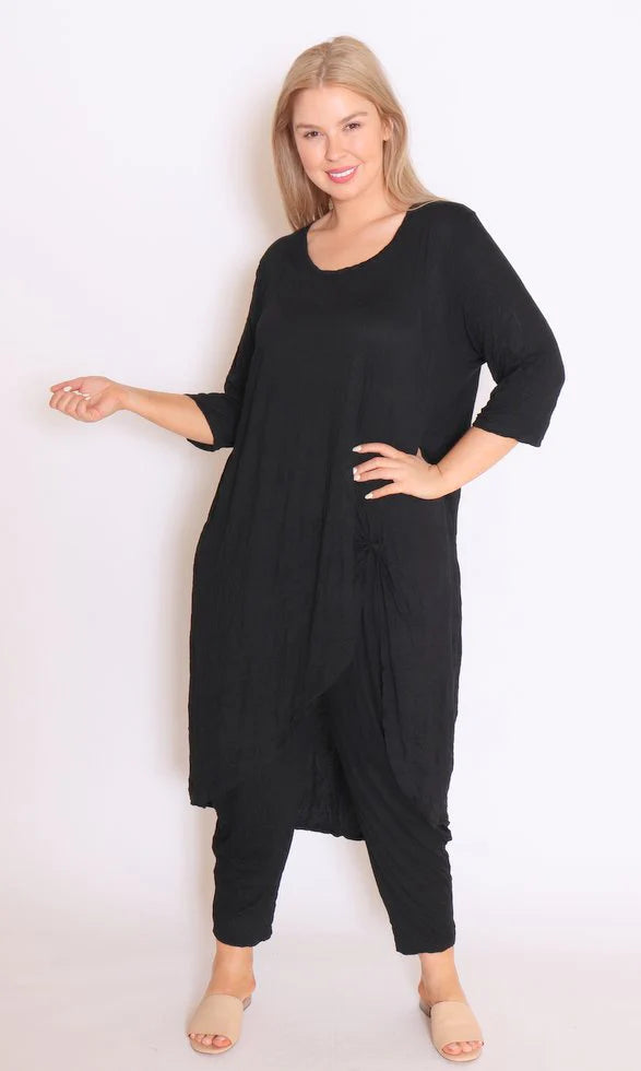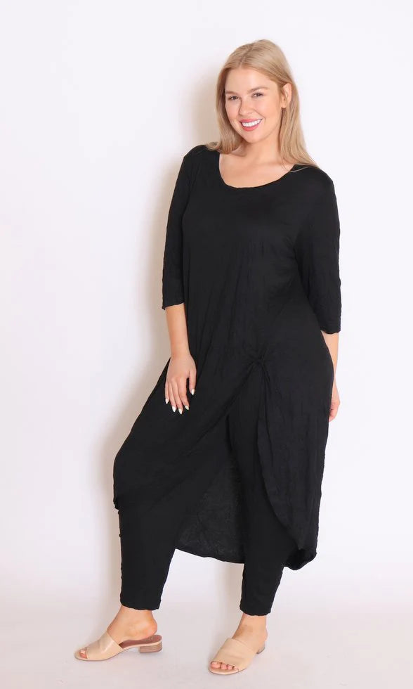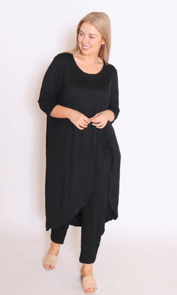 The hi-low design adds a trendy touch, while the side split detail gives it a unique and chic look. The versatility of this top allows you to dress it up with a pair of tailored pants and heels for a night out, or dress it down with jeans and sneakers for a more casual vibe. The round neckline is flattering and classic, making it easy to accessorize with your favorite jewelry pieces. The 3/4 sleeves provide a comfortable and stylish option for any season. Embrace your fashion-forward style with this must-have top that will elevate any outfit