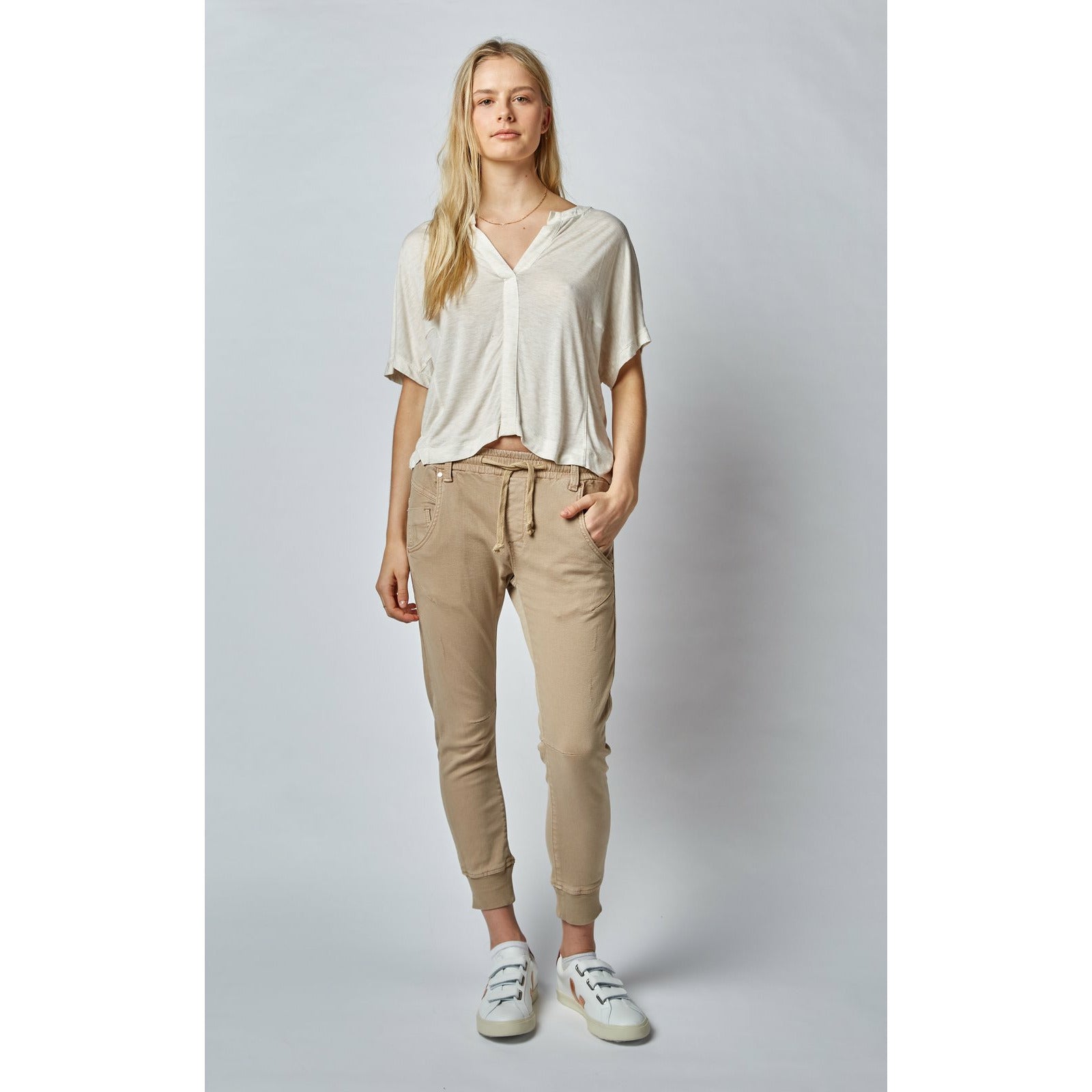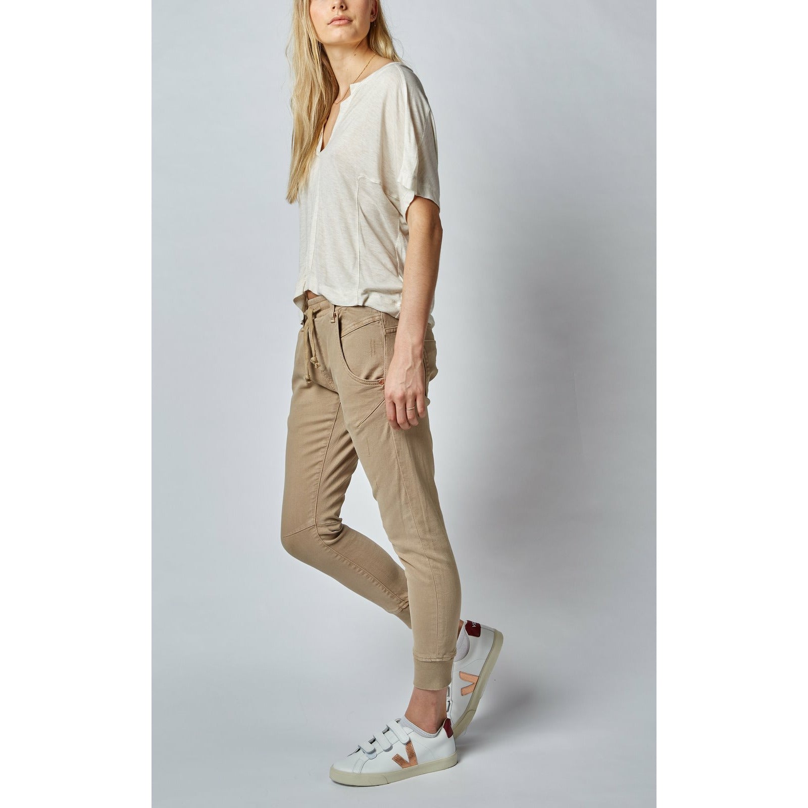 Active Beach Sand Jeans are a mid rise relaxed fit with elasticated waistband and sportive draw string. Scooped Front Pockets and an arched shape leg gives it a flattering look. These super comfy jeans with cuffed bottom look great paired with sneakers or heels. The slight distress front and the worn out look is done by hand scraping. All Fabrics, threads and labels are Oeko Tex 100 Certified meaning its free from harmful chemicals and dyes.