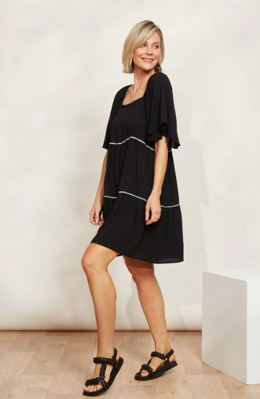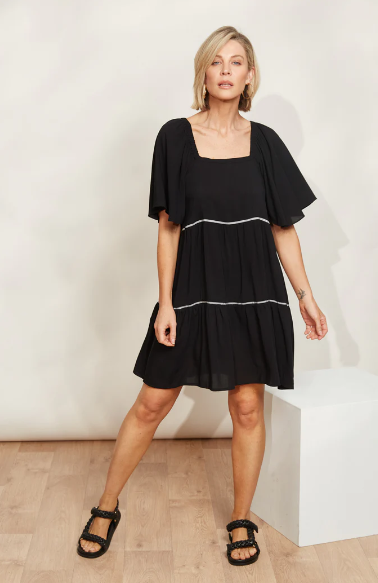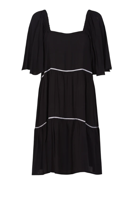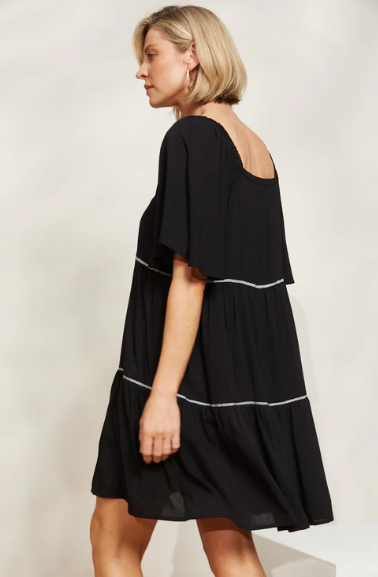 The La Mer Dress feels like slipping into the sunshine, bringing all the warmth and joy of the season. This adorable mini dress is all about fun and femininity, with flirty flutter sleeves, charming contrast detail tiers, and a knee-length that catches every breeze. With a flattering square neck, wear it on or off the shoulder for daytime adventures or evening soirées. Just slip on some strappy sandals, add your favourite simple accessories, and let the summer fun begin!