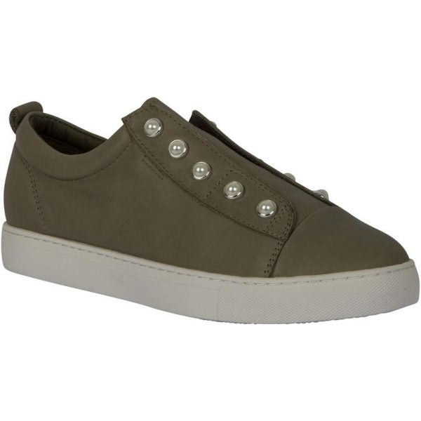 Handcrafted using soft quality leathers, a non-slip flexible rubber sole and a padded insole, you can ensure comfort all day long. This sneaker also features two rows of pearl embellishments running down the front of the shoe.