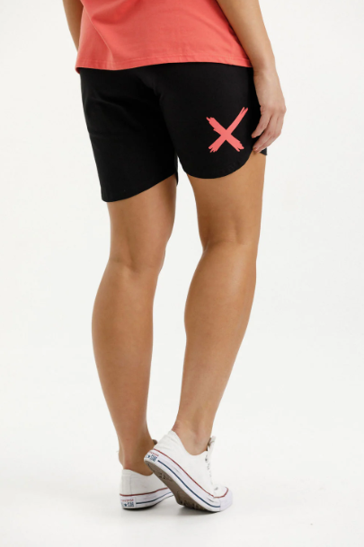 These shorts are black and feature a Berry coloured X on the back.