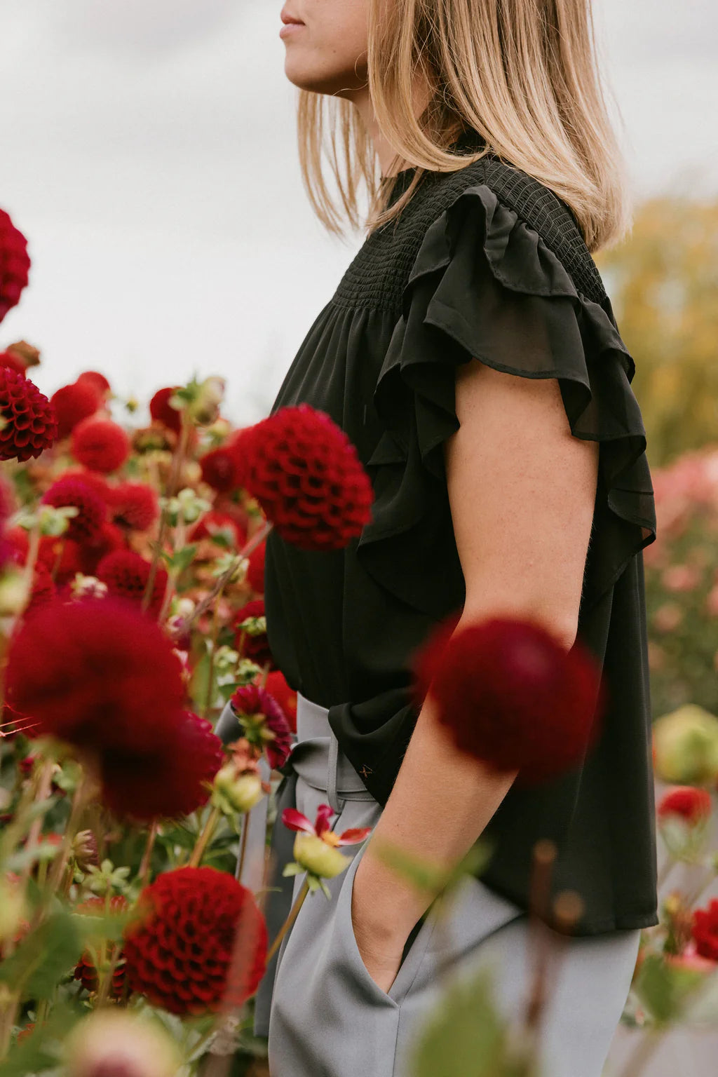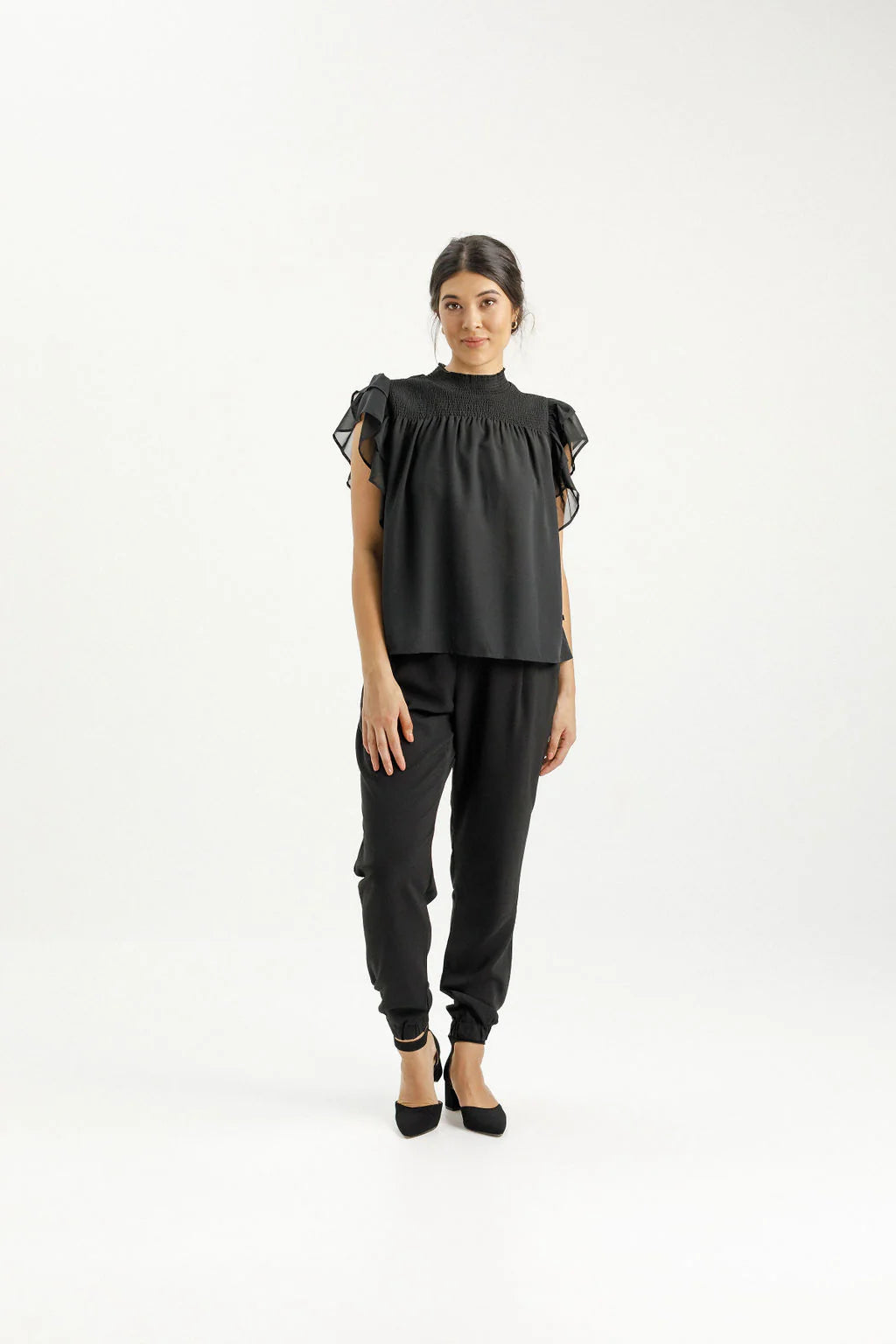 The Charlie Top has a shirred neckline, is fully lined, and has floaty frilled sleeves. With a straight cut hem, she is perfectly paired with our Billie Pants.