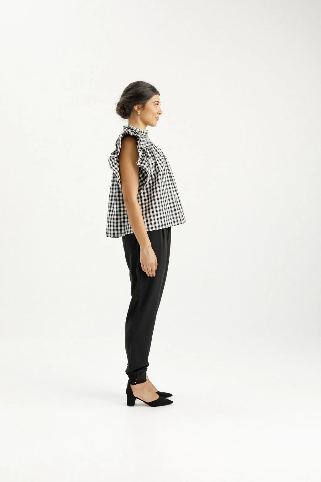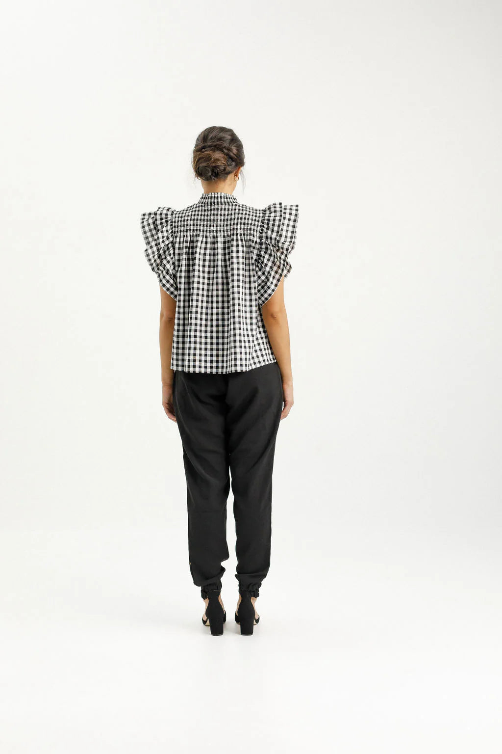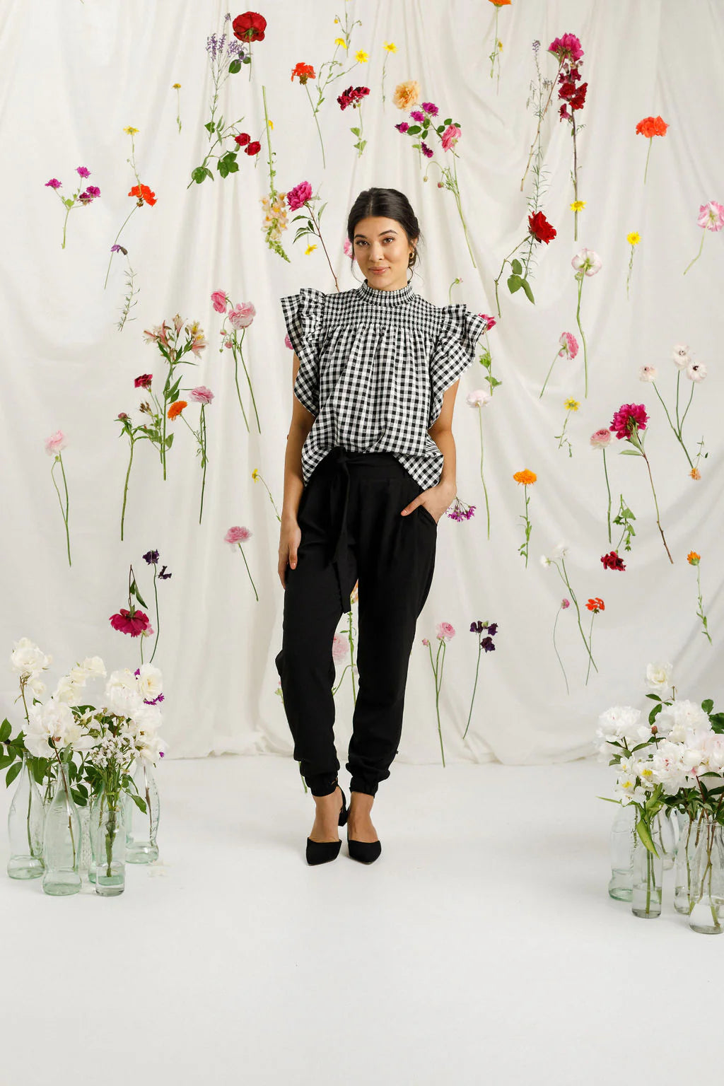 The Charlie Top has a shirred neckline, is fully lined, and has floaty frilled sleeves. With a straight cut hem, she is perfectly paired with our Billie Pants.
