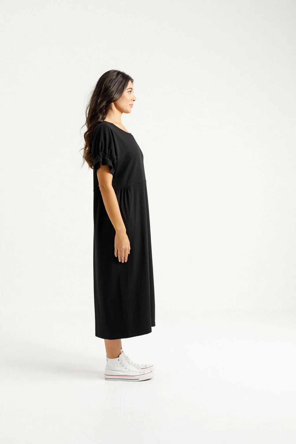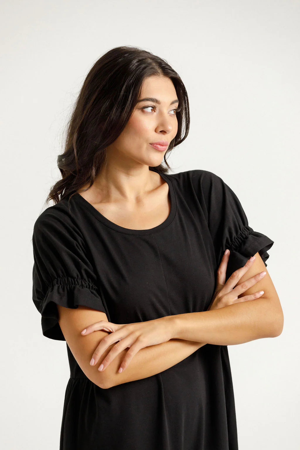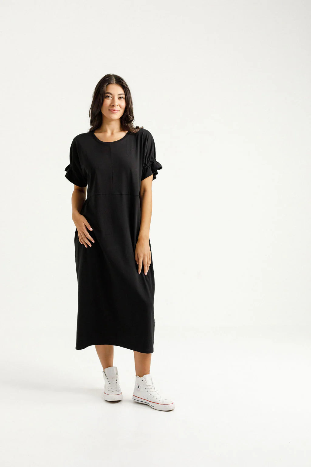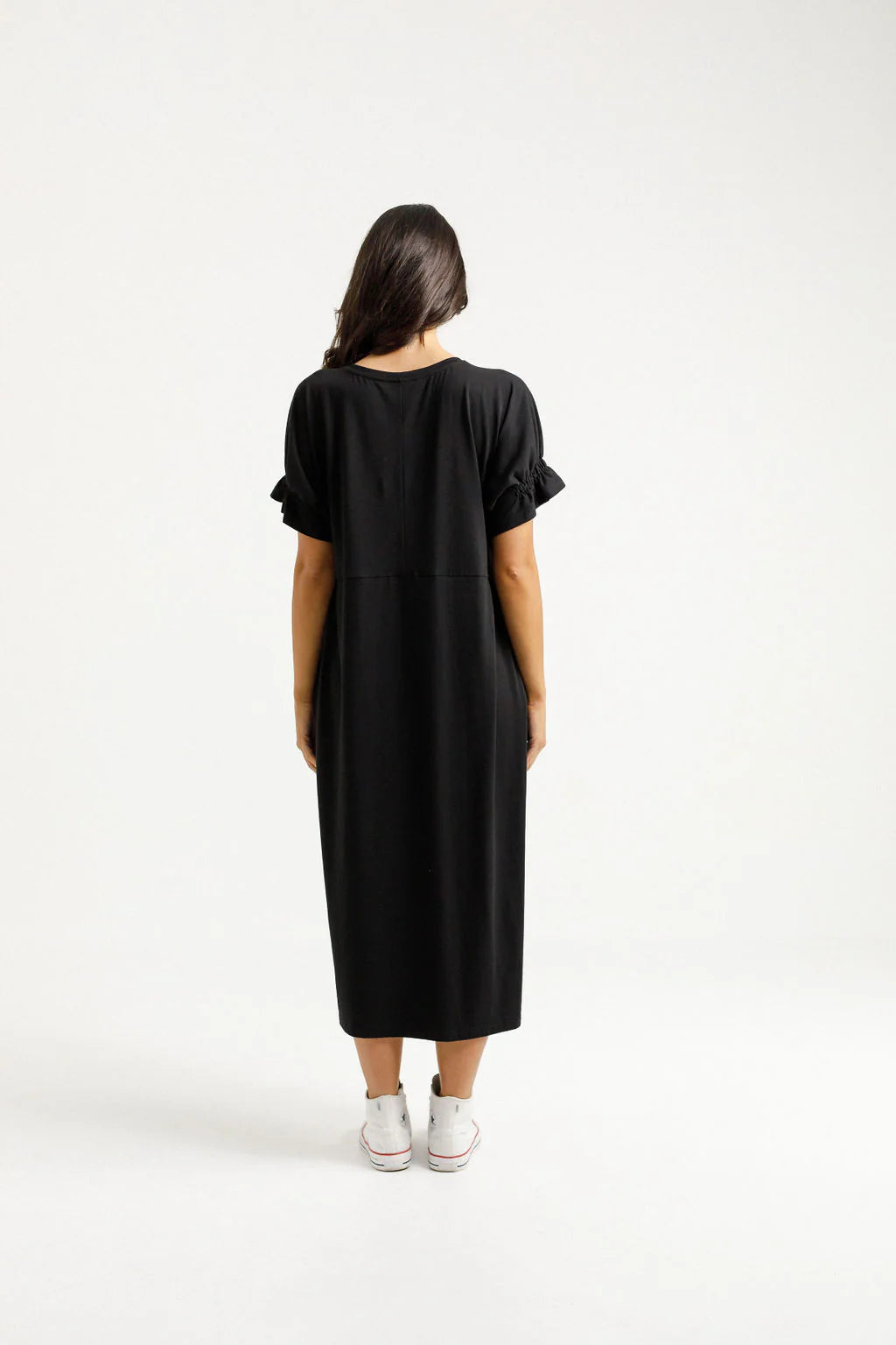 The Nevaeh Dress is a comfortable midi-length piece, crafted from a soft Cotton/Elastane blend that offers just the right amount of stretch and drape.