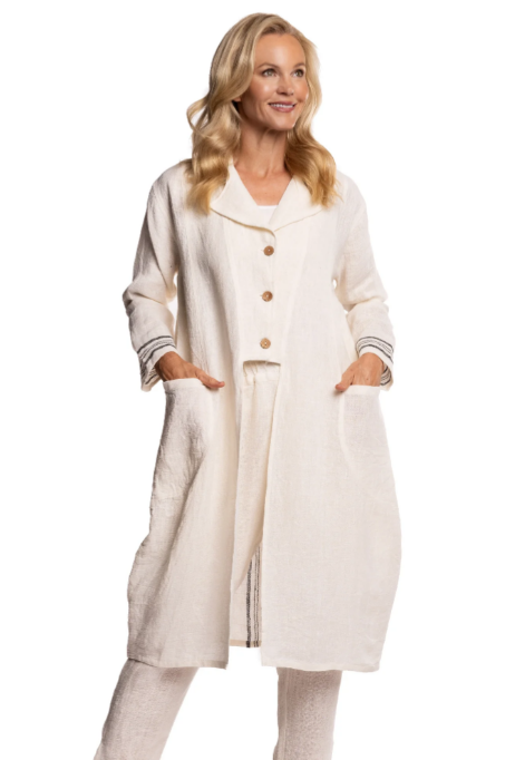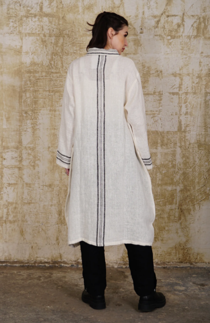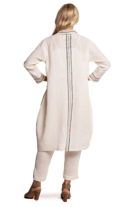 The Mamie Jacket is your next winter statement piece adorning striped detailing, a collared neckline, and a long hemline. The Mamie's most exciting feature is when buttoned up, a dramatic cutout appears displaying the garment underneath. Crafted from pure linen, trust your Mamie will last for years and never go out of style!