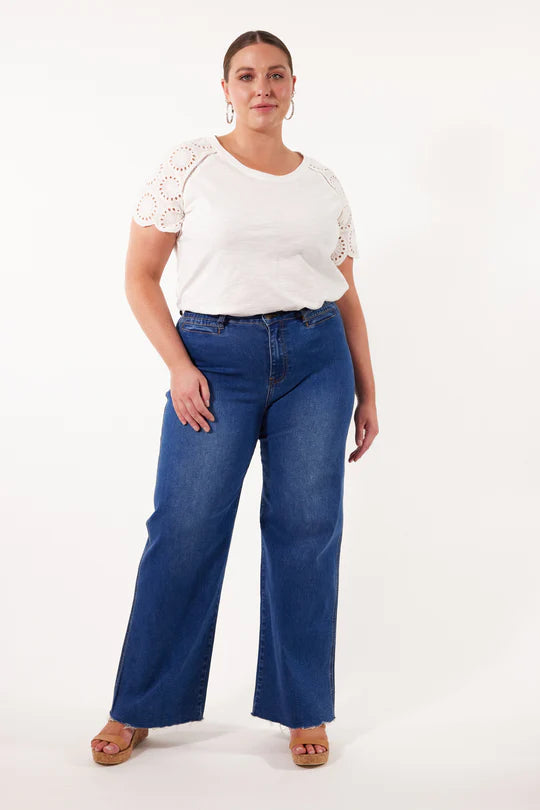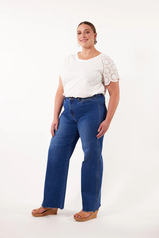 Say hello to your new favourite denim jeans! The Tate Denim is guaranteed to make an impression - with a classic wide-leg silhouette and a mid-rise fit, these denim jeans provide an effortless look that will complement any outfit. It features a button and zip closure with pockets and a raw edge ready for any occasion. Style it with a tank, cape and glam accessories for cocktails with the girls or a soft knit and sneakers while you run errands.