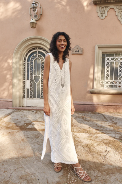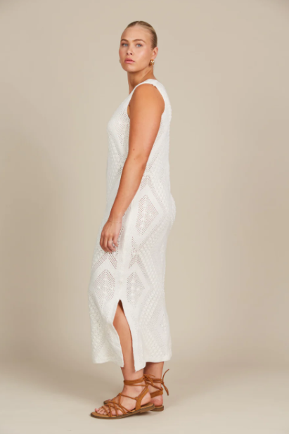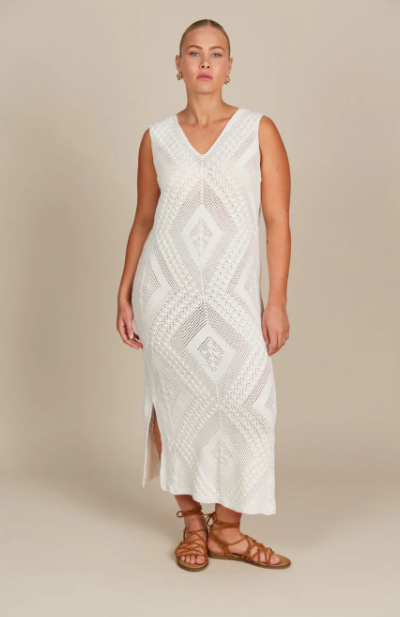 Savour the magic of summer nights while dressed in the Sylvie Dress. This knit dress features a vintage-inspired weave, made from a comfy cotton blend, that exudes charm with its semi-fitted silhouette. Falling elegantly to a midi length, it showcases a flattering V-neck, wide shoulder straps, and high side vents. Whether it's a wine tasting or a casual gathering, complete your look with strappy sandals and minimalistic accessories.