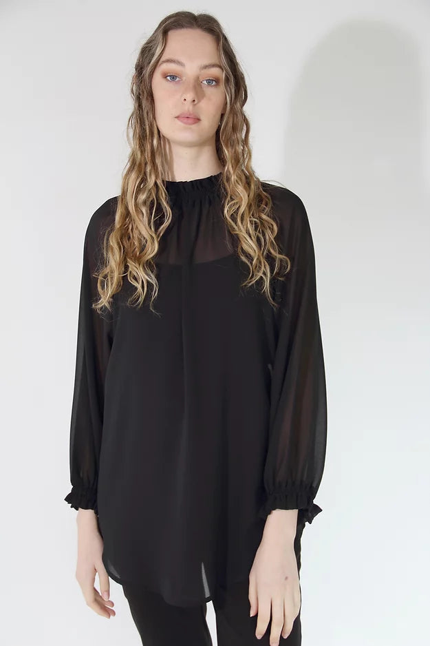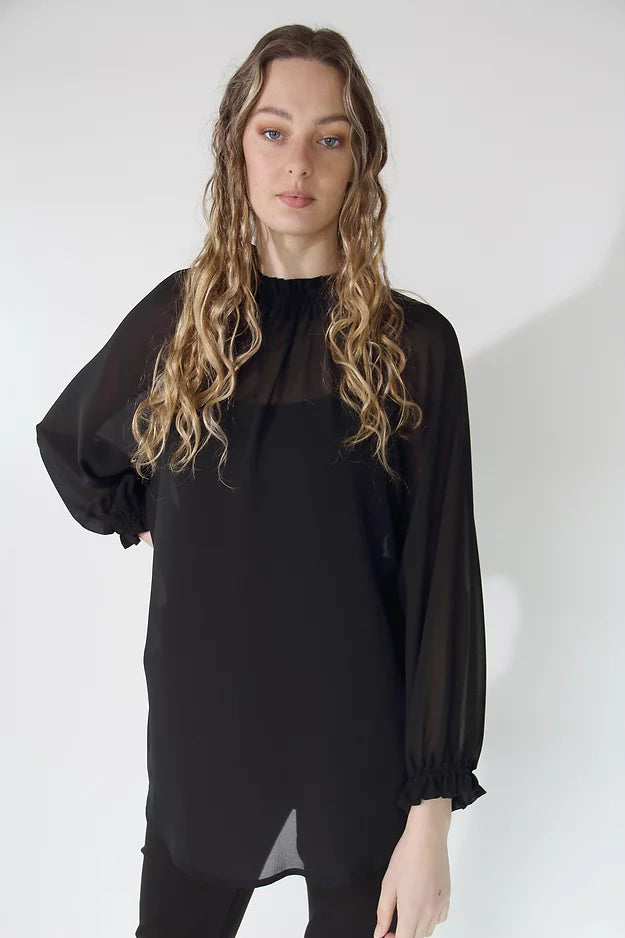 Sheer Georgette blouse with elastic neck detail. Raglan style sleeves finished with a elastic cuff.