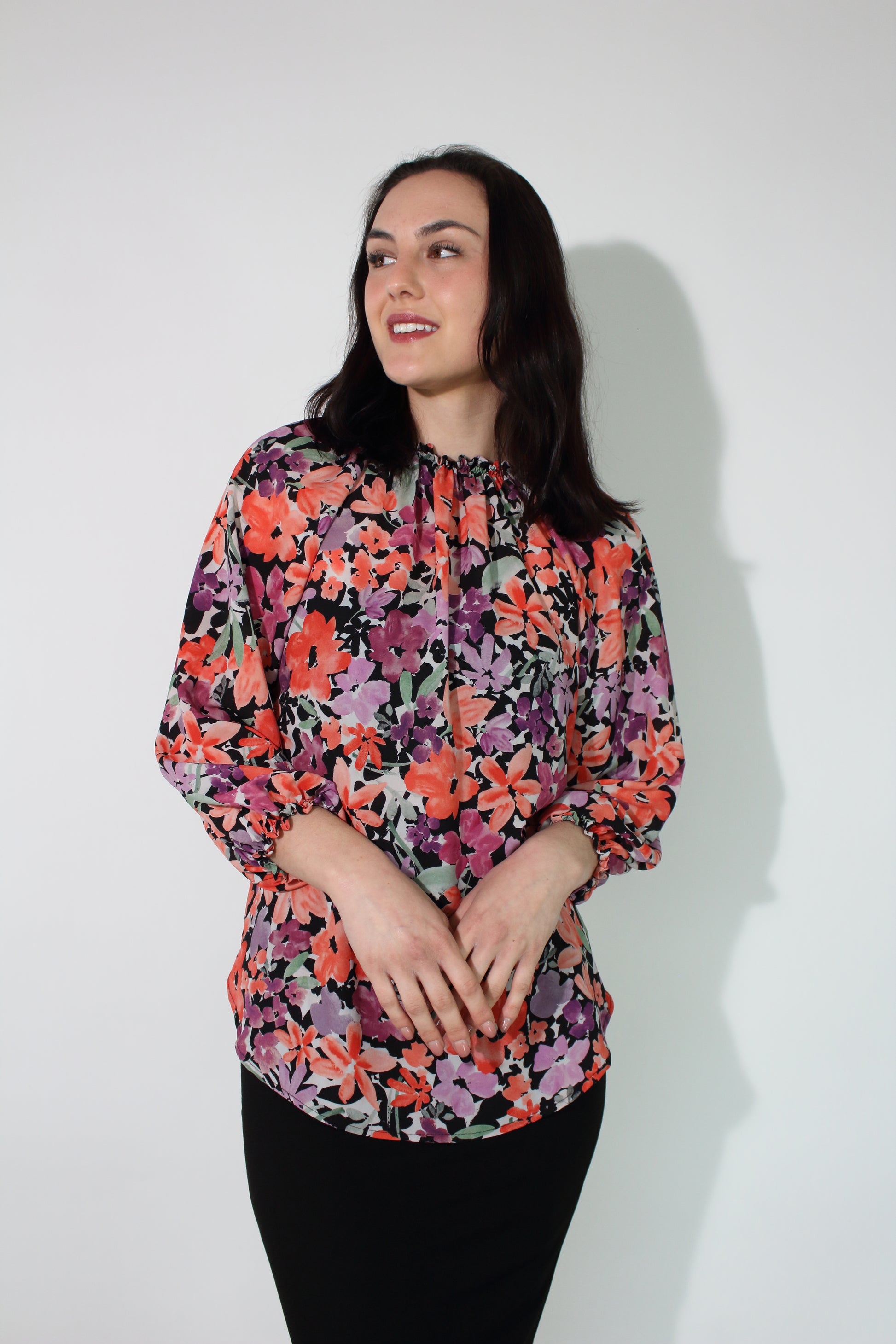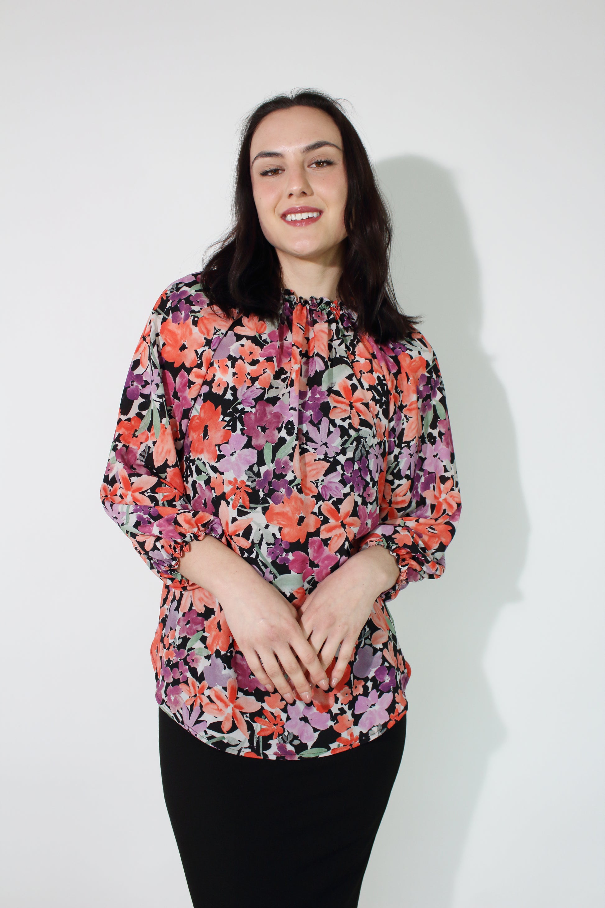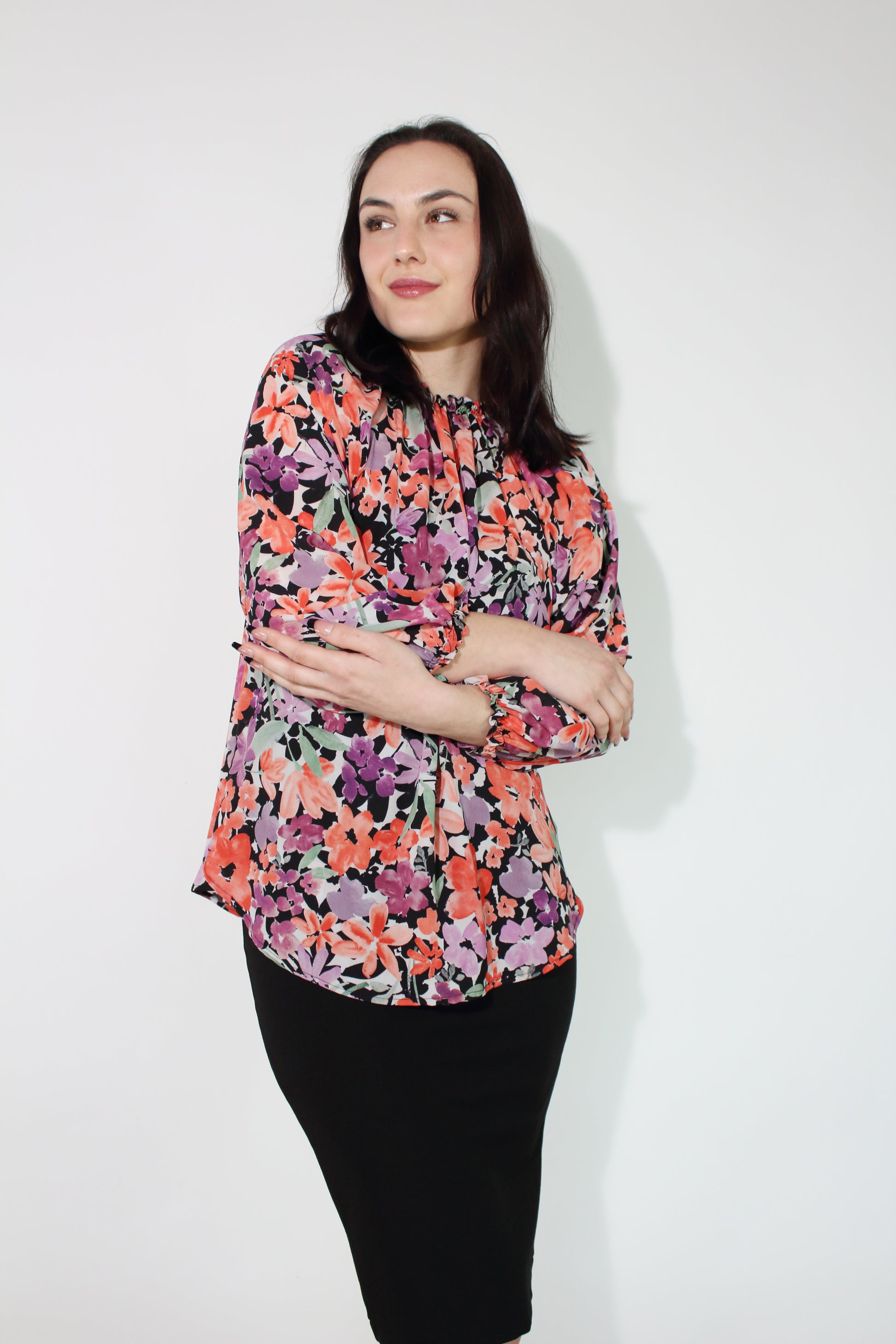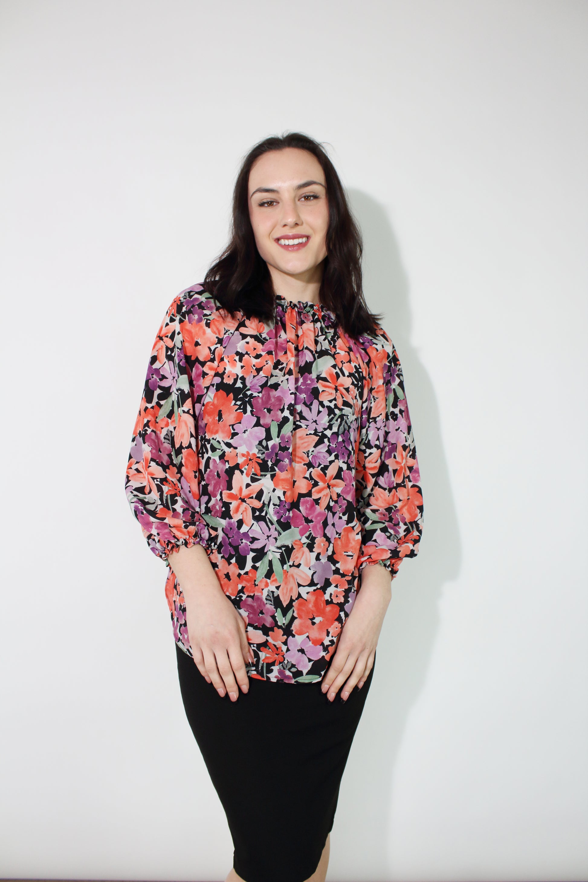 Elastic neckline, raglan sleeved blouse. Curved hems, finished with elastic cuffs.