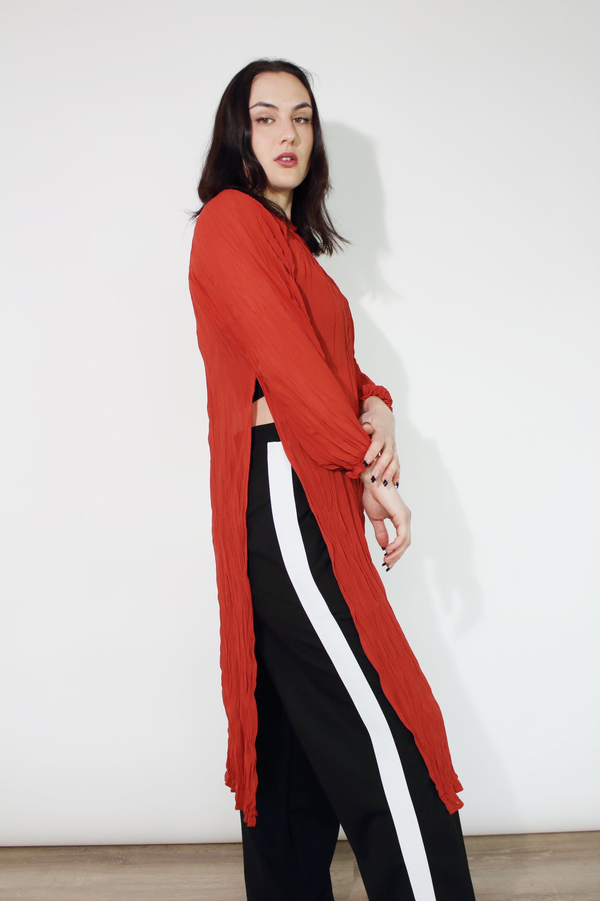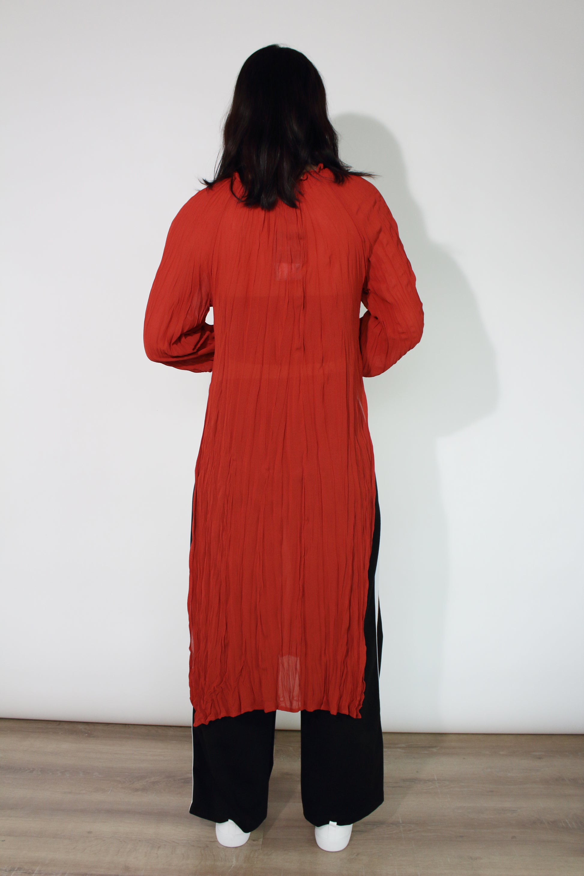 With the high splits on the side, this dress gives you an option for a warm under piece this season! You can wear over a slip, jeans or tights! The crinkle look makes it more elegant