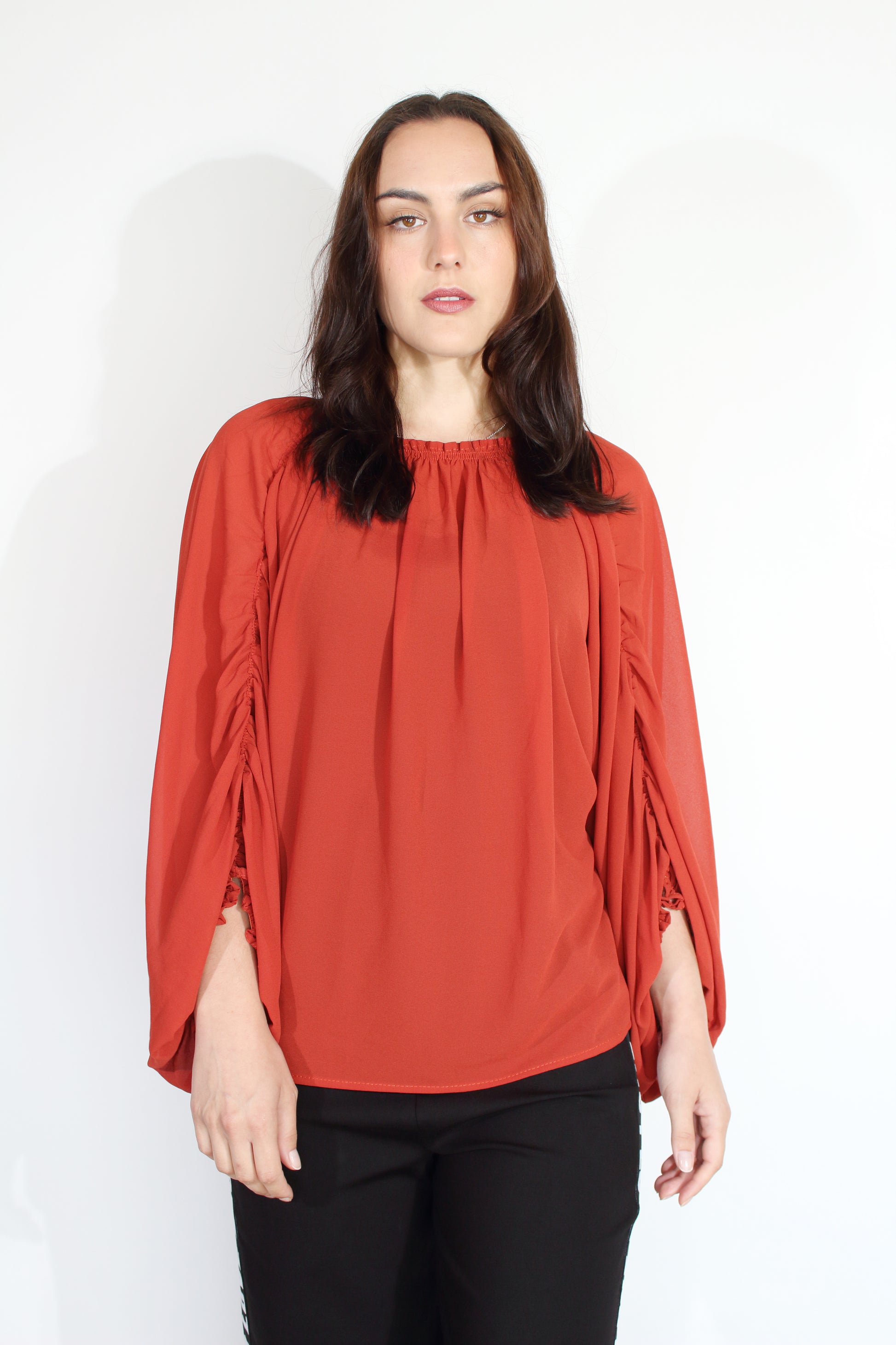 Oversized batwing style blouse, with rouched elastic sleeves. Elastic neckline and cuffs.