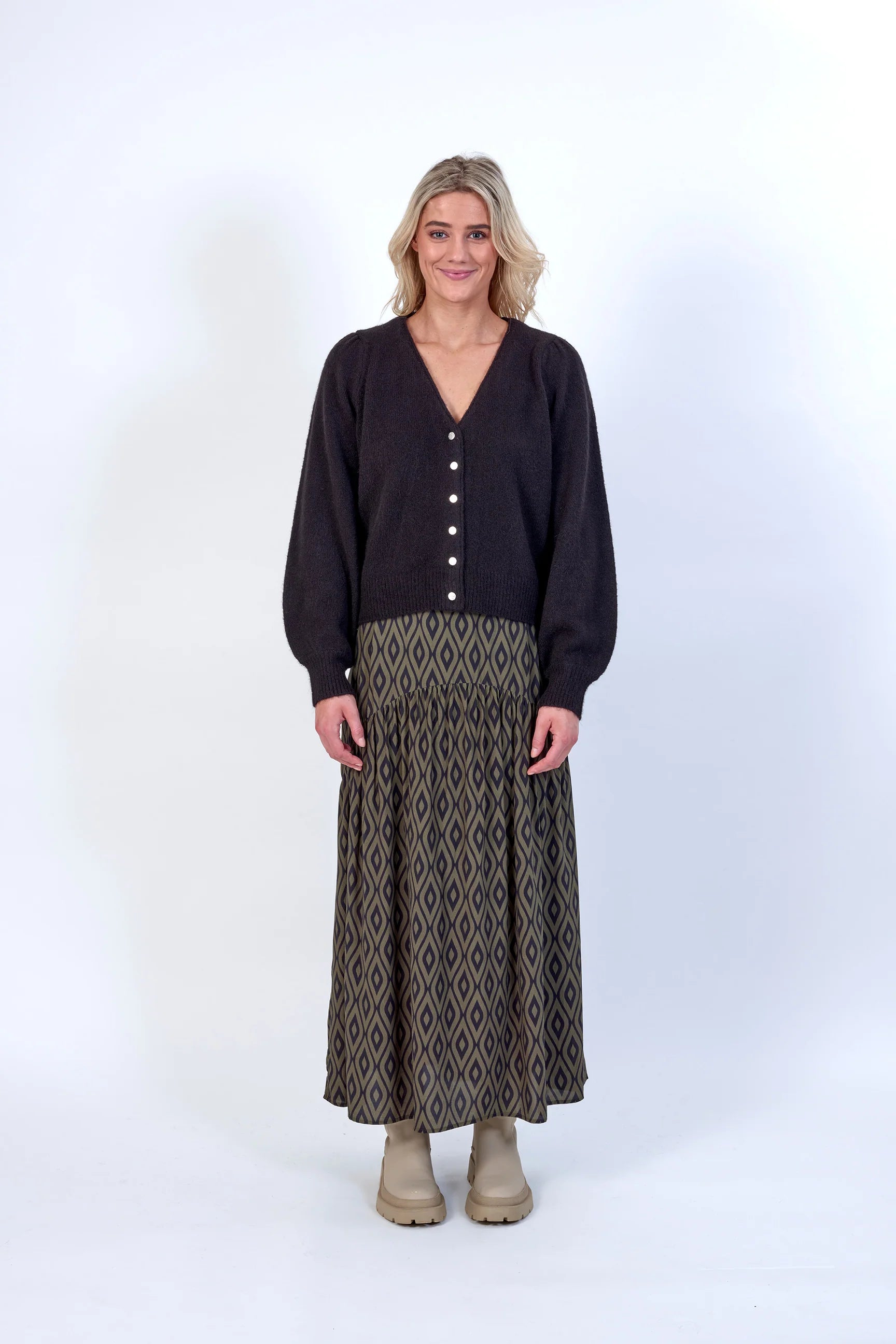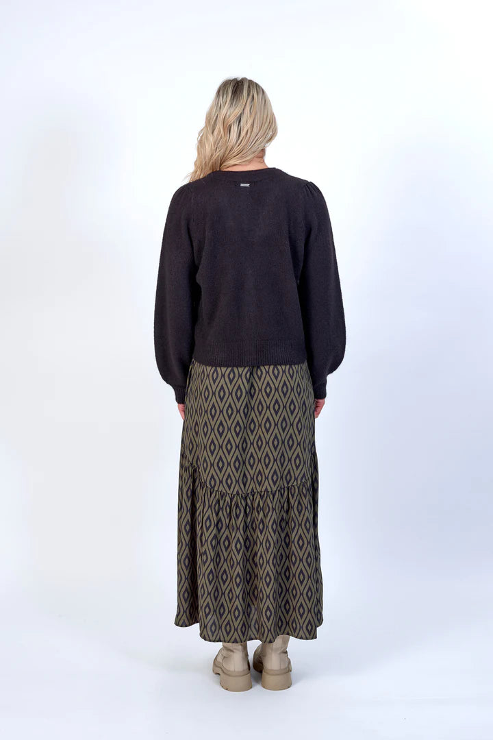 • Long blouson sleeves with ribbed cuff and shoulder gather