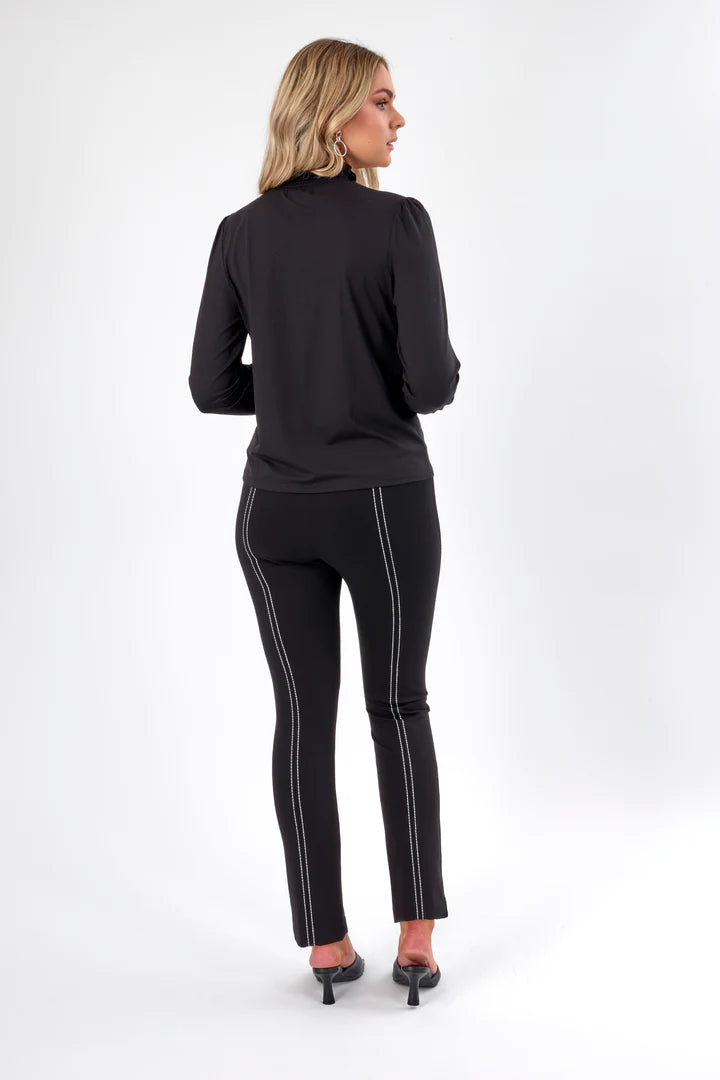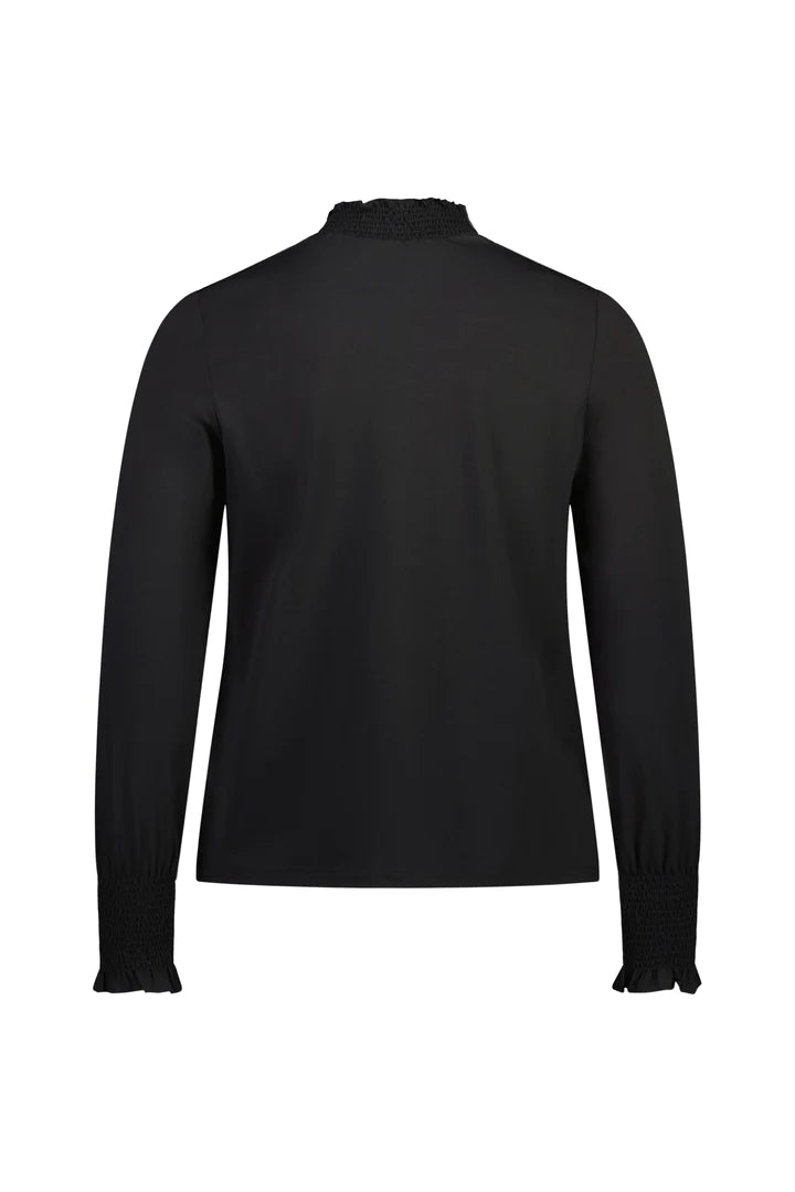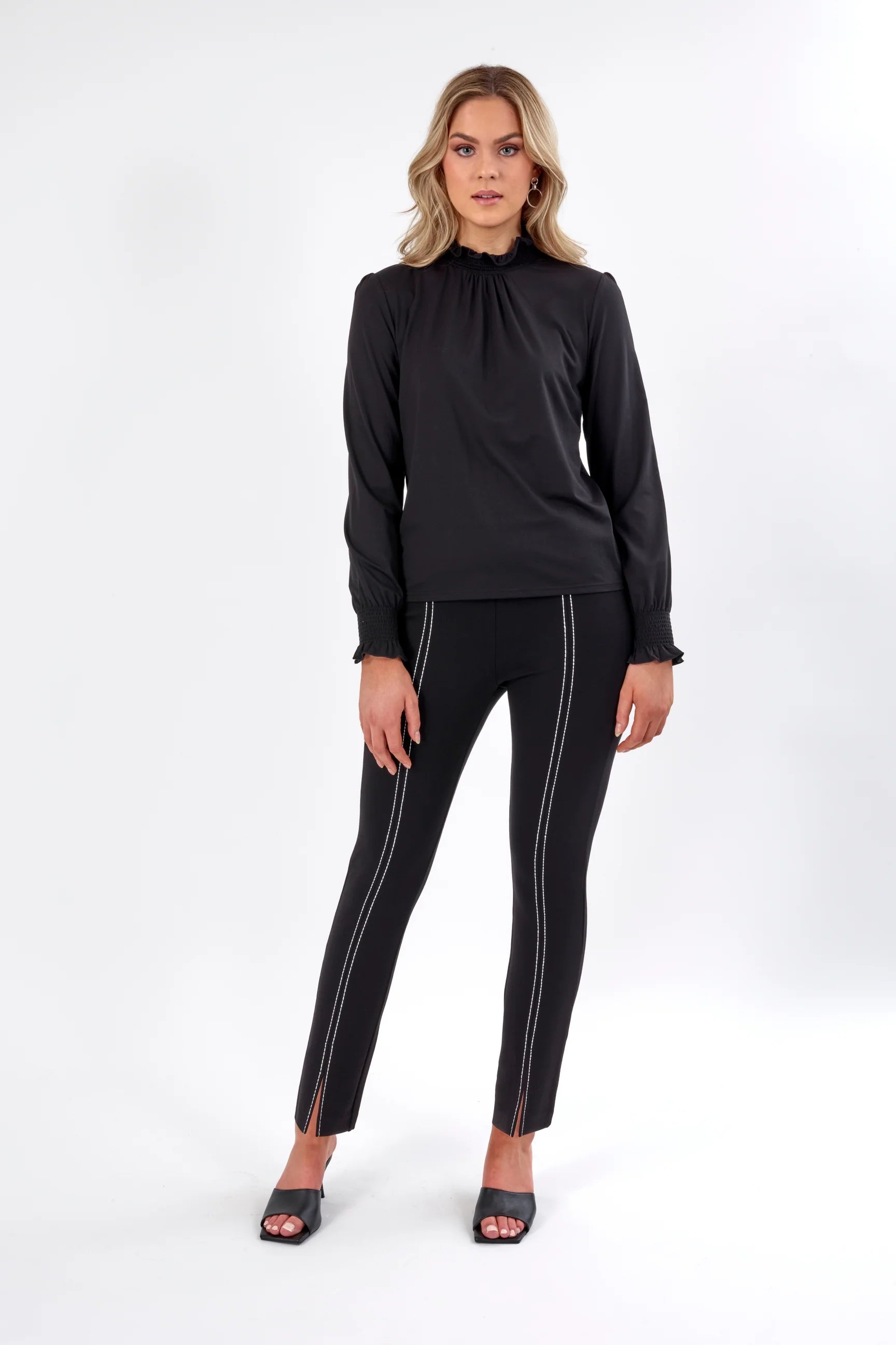 • Shirred high neck and cuffs with ruffle edge and babylocked finish