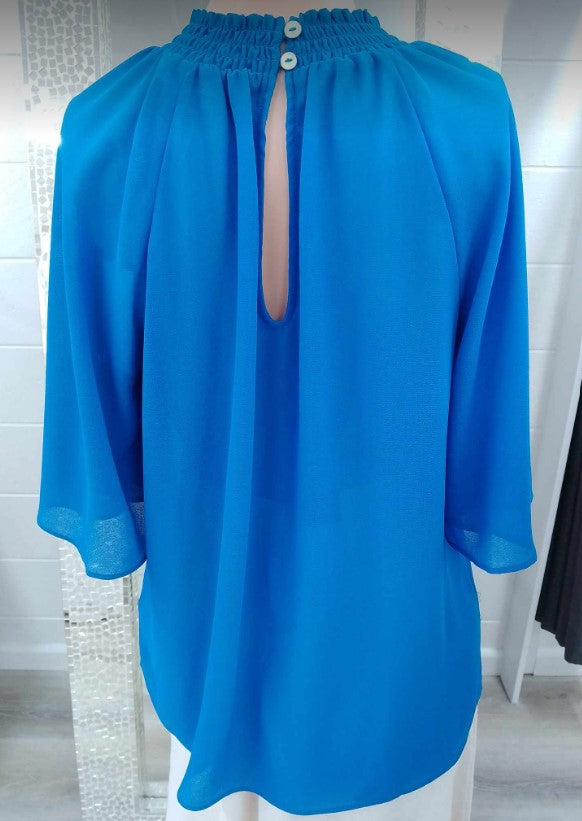 • Shirred neckline with double shell button closure and keyhole at centre back
