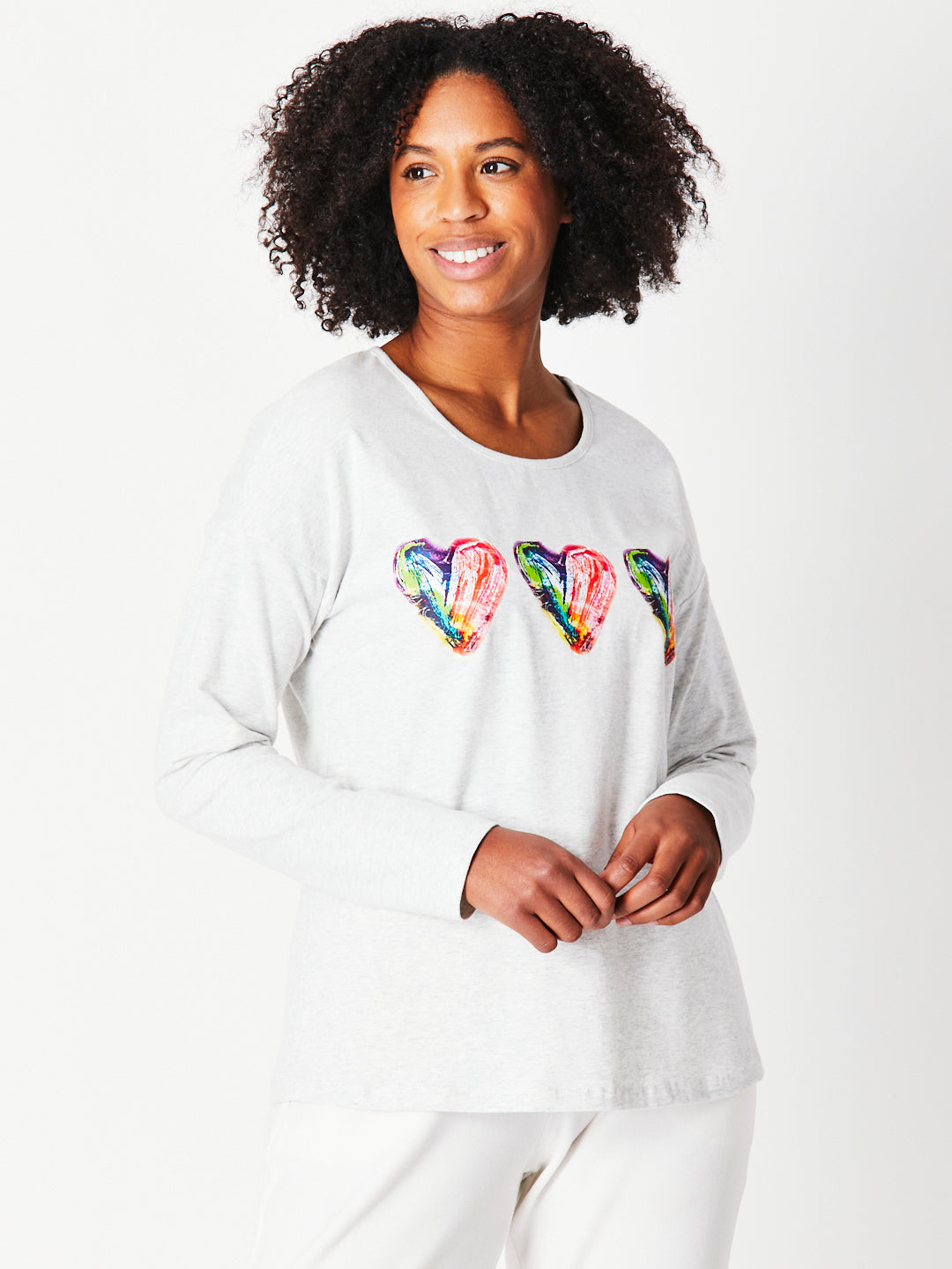 This white long sleeved tee is sure to bring a touch of joy to your wardrobe. The three vibrant hearts add a pop of color and a sense of warmth to your outfit. Perfect for casual outings or lounging at home.