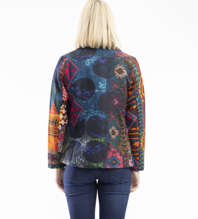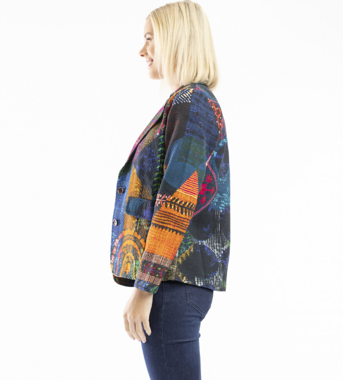 Elevate your winter wardrobe with a statement in our Digital Blazer. Easy to throw on over a t-shirt and jeans, this is the perfect piece to add style and sophistication into your daily outfits. Featuring vivid colours, intricate prints, 100% organic cotton, faux front pockets, structured shoulders, and single breasted buttoning, this is a blazer that is sure to make you stand out in a crowd.