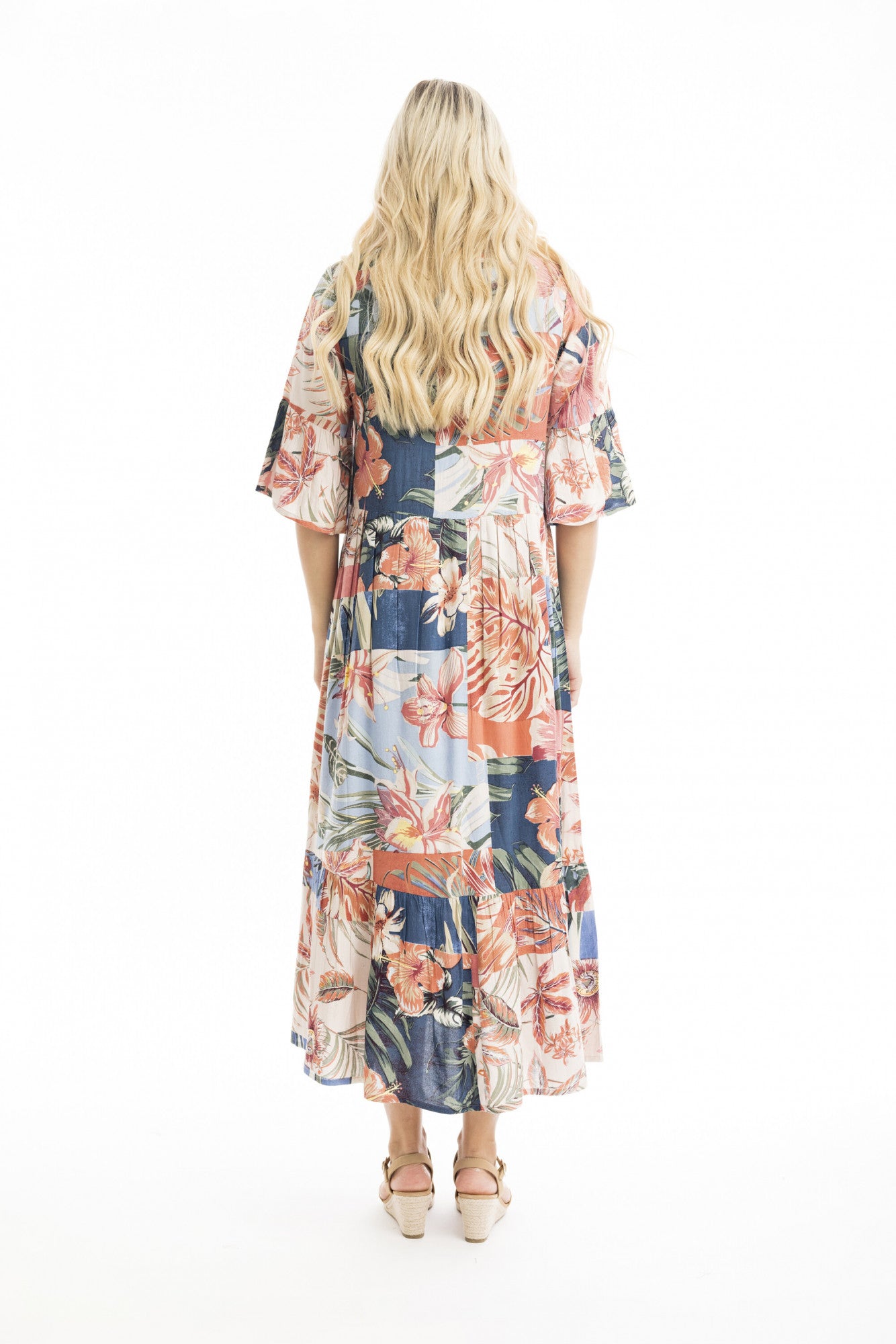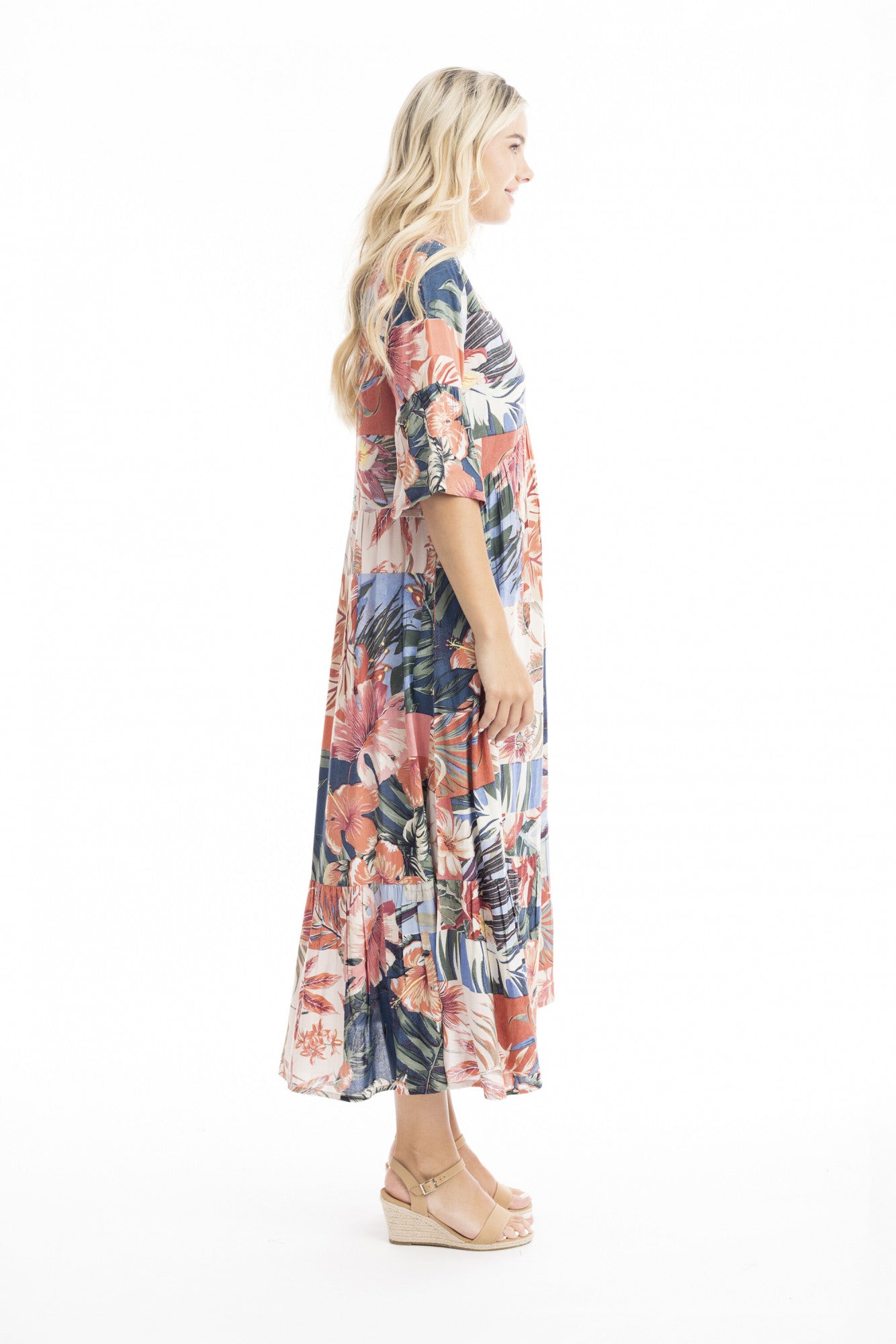 Enjoy endless summer days in our colourful Luzon dress. Perfect for beach holidays, this flowing maxi dress features a gorgeous vibrant print, 3/4 sleeves, a v-peak seam at the waist, and a flattering V-neckline. This beautiful dress is a must have for your summer wardrobe!