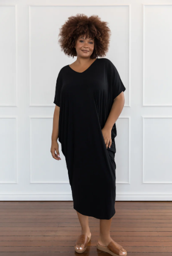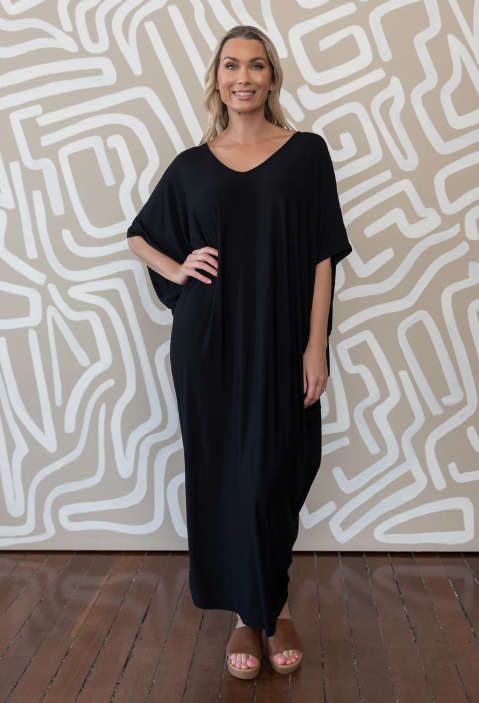 Feel comfortable and confident in our best selling Miracle Dress in Black. Our signature soft and breathable fabric is made from sustainable bamboo fibres and will have you feeling cool and carefree. Featuring batwing style, draped sleeves, a maxi length hemline, and a reversible V-Neckline for more coverage as a boat neck. With our Maxi Miracle Dresses, you'll be ready to impress.