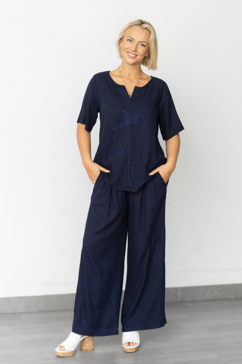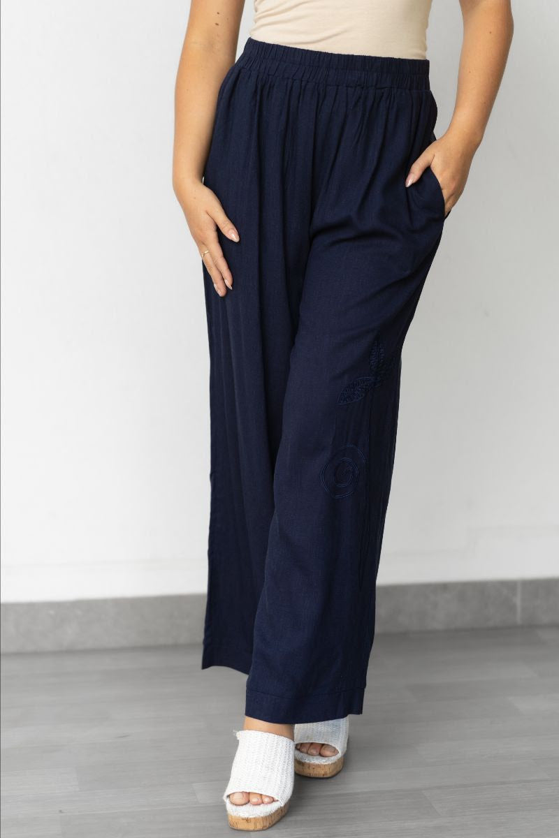 QQ Fashion | Tropical Embroidery Wide Leg Pant - Navy
