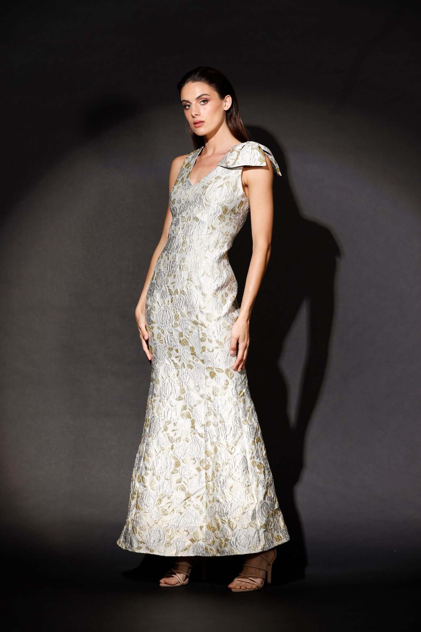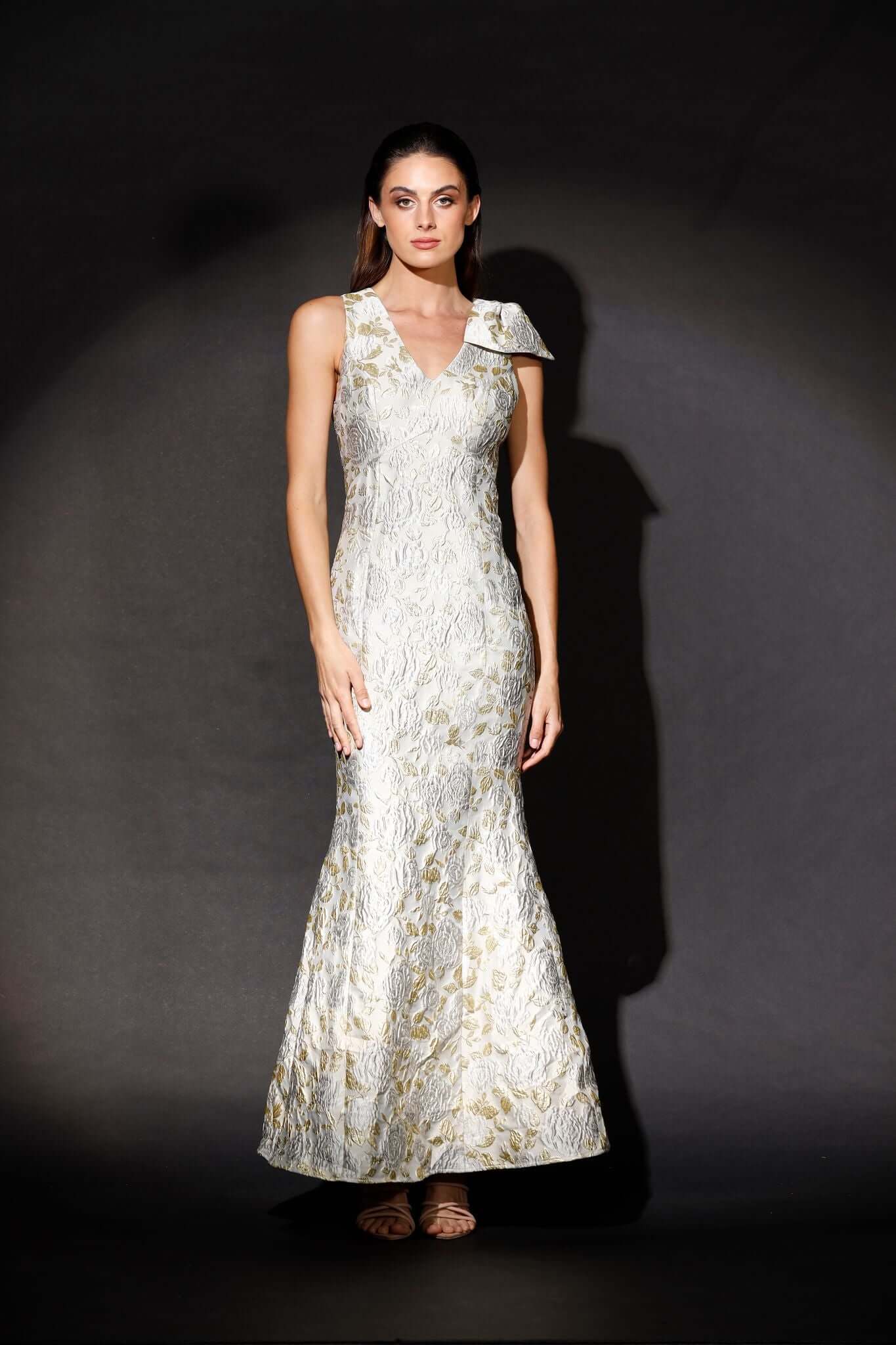 Cream roses with gold leaves adorn this simply elegant cream satin gown. Finished with a lucious bow on one shoulder.