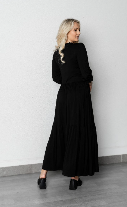 This black dress, featuring shirred on front and back with a flowing silhouette, is suitable for all occasions. The fabric is 100% modal which is a natural material, super soft, which keeps you feeling fresh and cooler in the summer, and warmer in the winter, The sleeves have an elastic cuff enabling you to wear up and tiered layers creating a flattering shape that moves gracefully. Available in Sizes 8 to 18